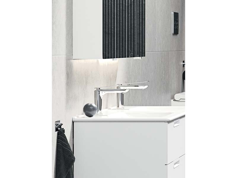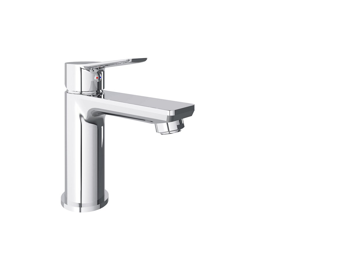 A small, contemporary washbasin mixer perfectly suited for smaller washbasins. Features an environmentally-friendly cold start function.