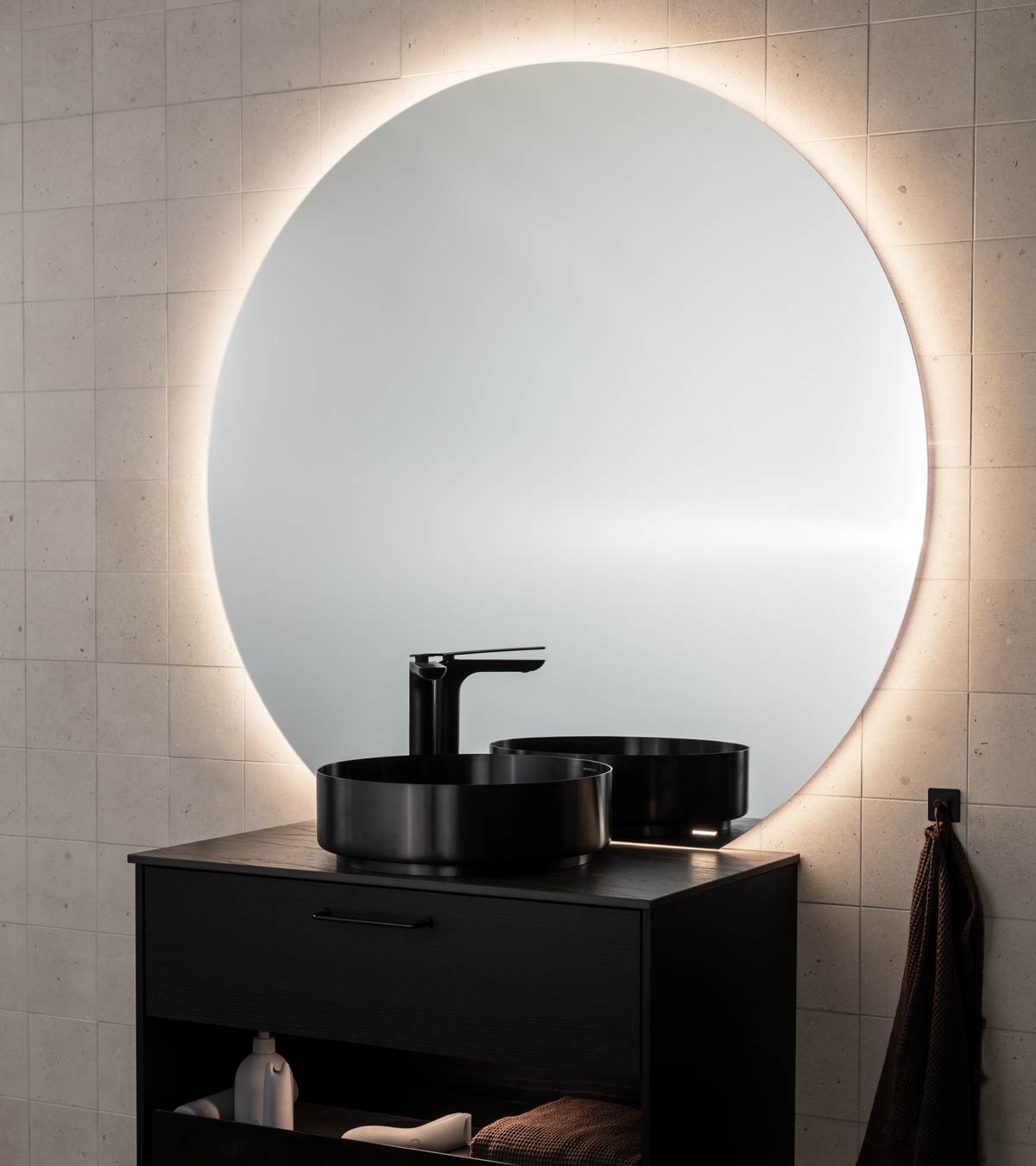 Early morning, late evening or the middle of the night? It’s great to be able to change your lighting to suit the situation and the time of day. Sometimes you want softer lighting for a calm atmosphere. Everyone needs storage, but many people choose to only install a mirror above the basin and have the storage units on the side. We have mirrors with lighting on top, behind, underneath or with recessed lighting. All our lighting solutions use LEDs and provide comfortable light. If you want a round mirror with integrated lighting around the edge, check out our popular Selfie mirror.